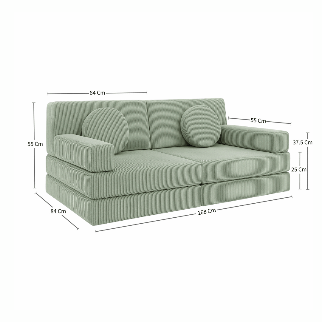 The Shortie: Compact and Charming. The Shortie features two thick bases, two full-length trapeziums, and two armrests, tailored for smaller spaces without compromising on the fun. The Shortie is simply 24cm shorter that the playcouch on one side.