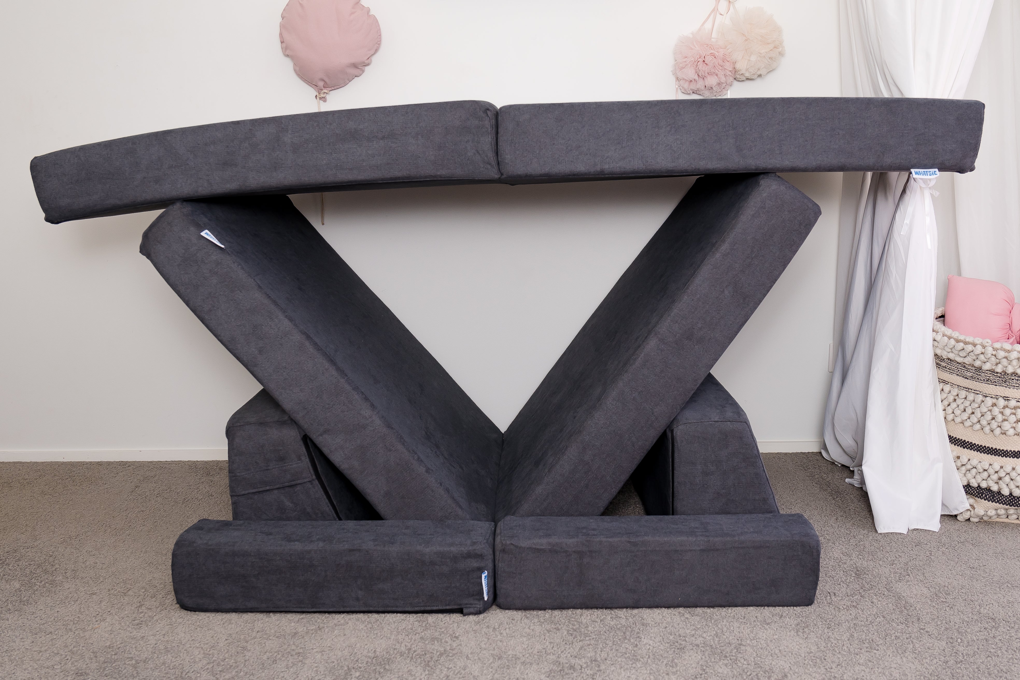 - Two full-length trapezium pieces – each measures 84 cm long × 30 cm high × 25 cm deep. These uniquely designed cushions add structure to builds, work as ramps, balance beams, or supportive backrests, and are one of the key features that make the Whatsie stand out from other play couches.