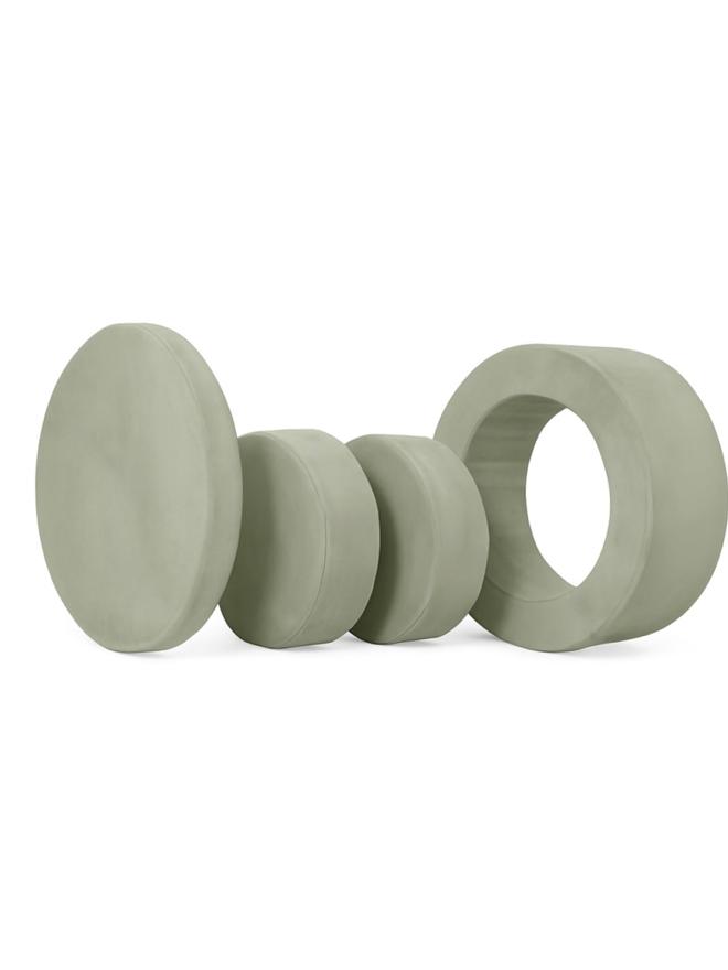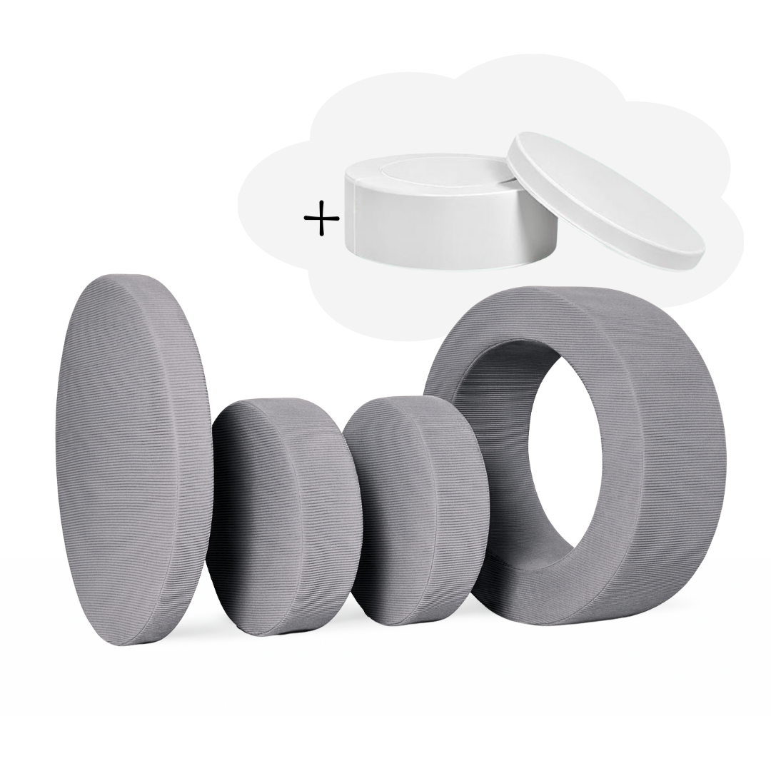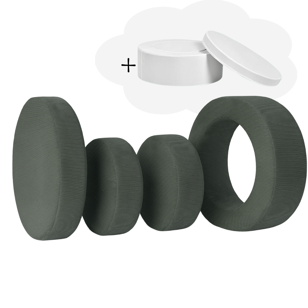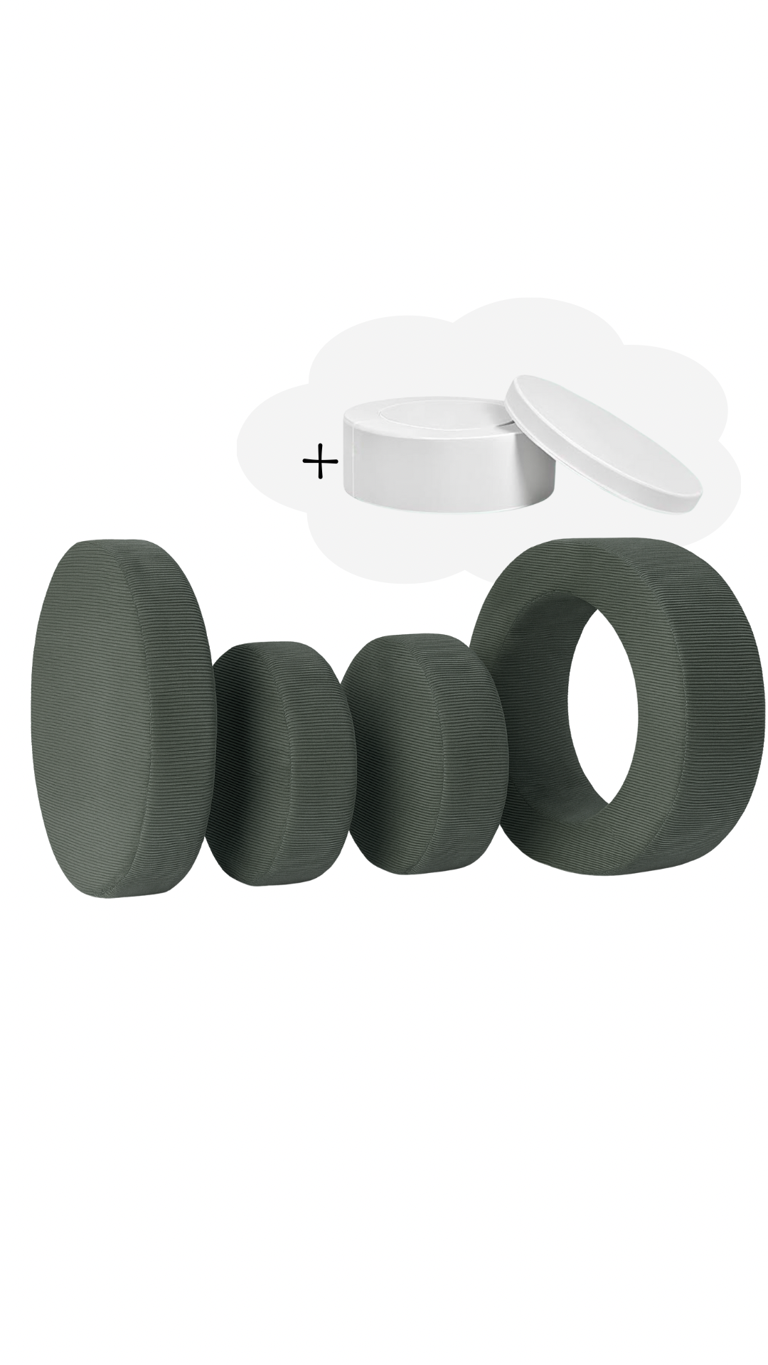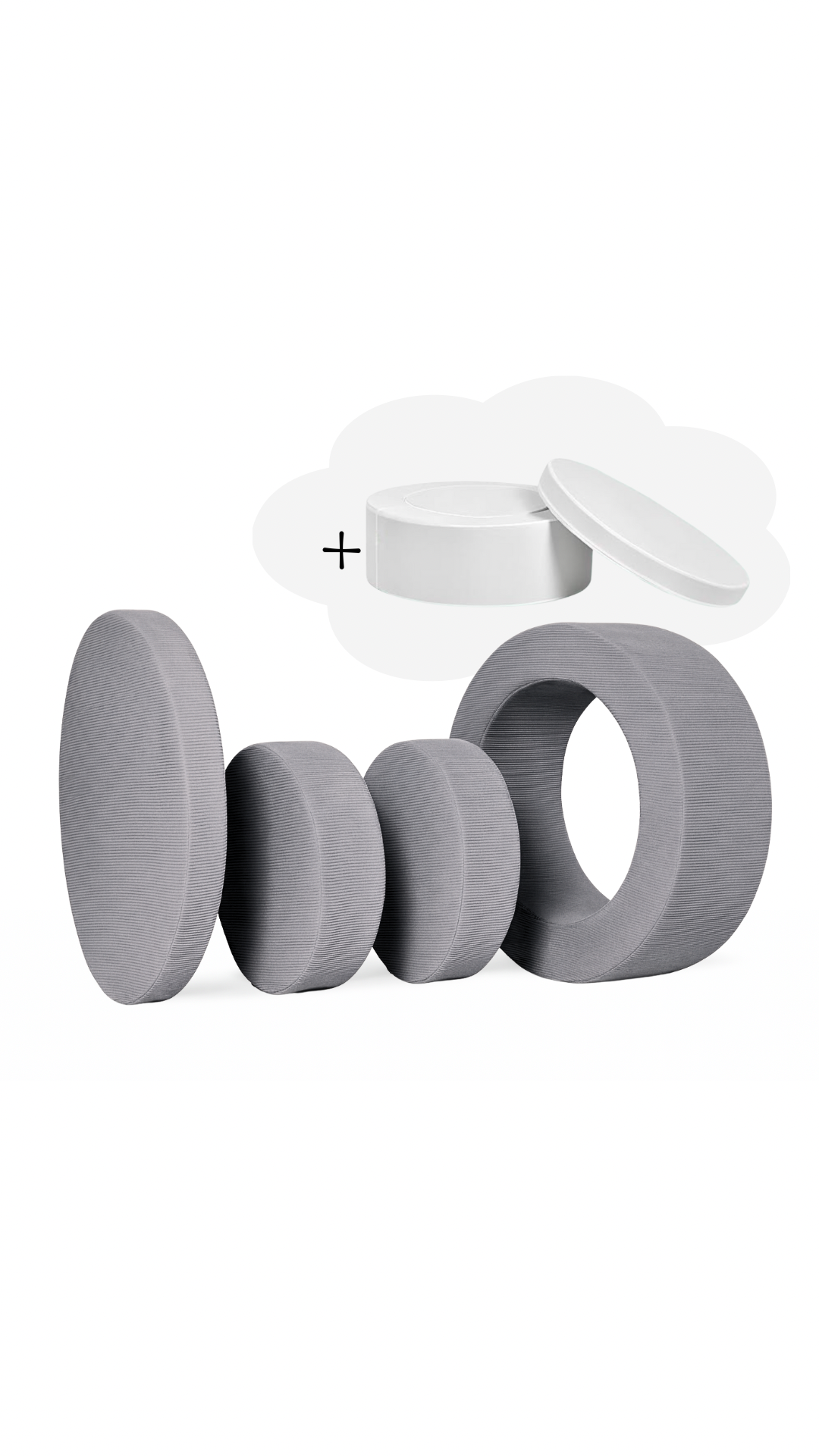 - Two bonus spot cushions – included with every Shortie, these round cushions can be used as stepping stones, seats, or creative play pieces.